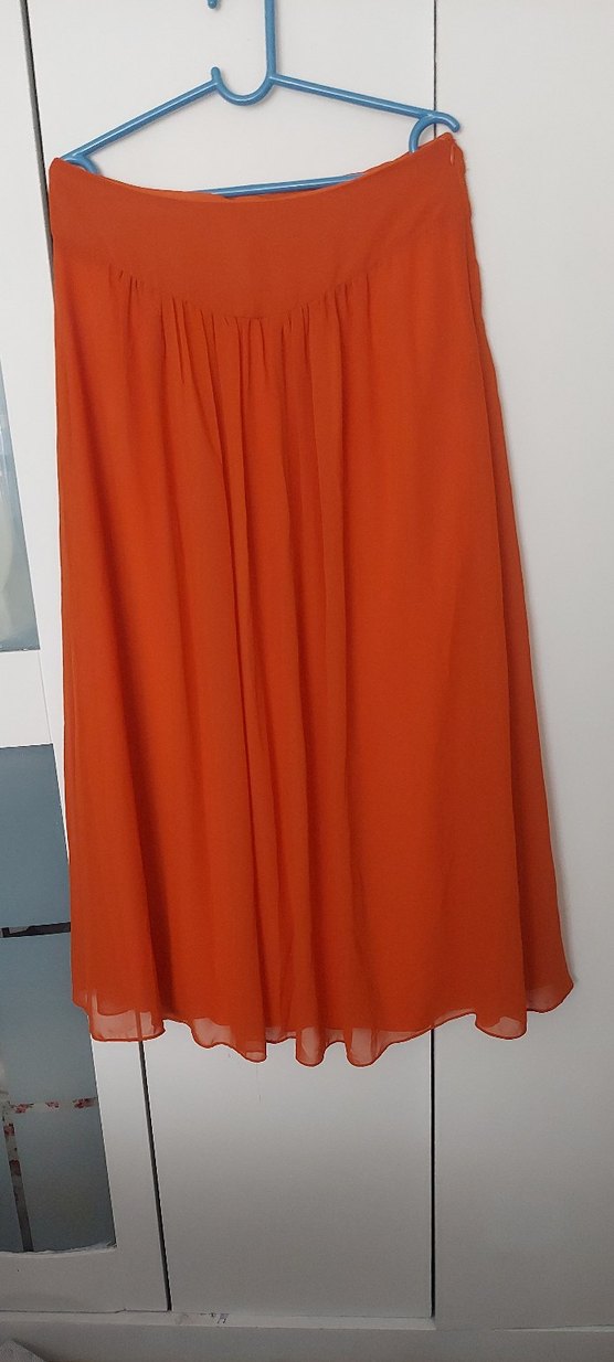 Turuncu, satenimsi kumaştan, salaş kesimli ve drapeli uzun kadın eteği. Minimalist ve çağdaş tarzıyla ofis ortamına uygundur. şifon etek.astarli. sorunsuz. beli 42 cm boyu 99 cm.