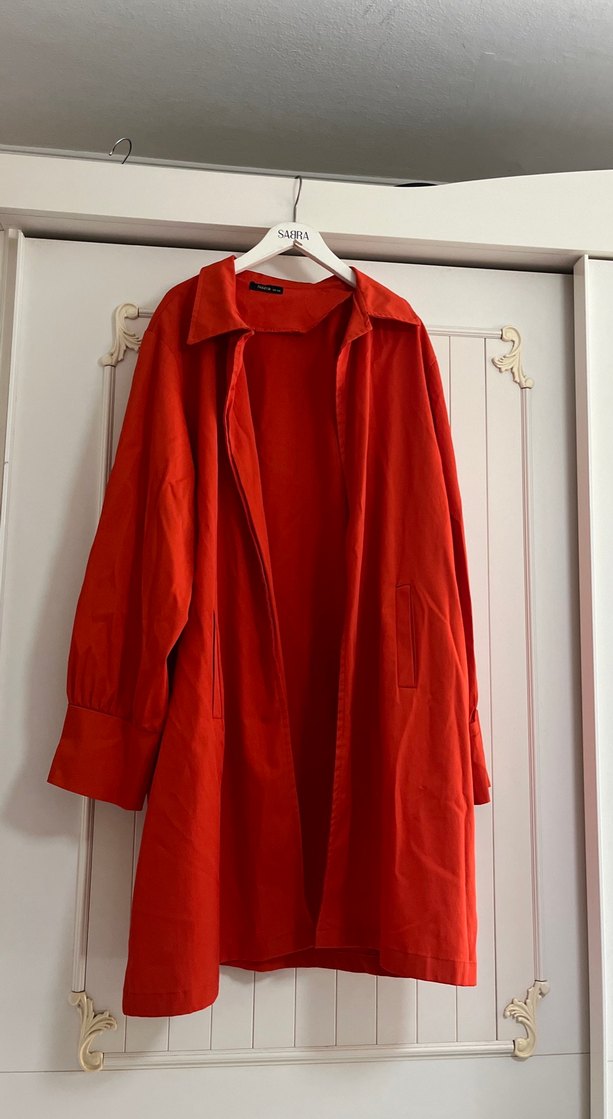 Parlak turuncu uzun kalın trençkot, bol kesim ve uzun kollu, kesik yaka detaylı. Dökümlü tasarımıyla minimalist sokak stili, günlük kullanım için uygun.Kuşak kayıptır bulunursa eklenecektir fiyat o yüzden düşüktür. Boy:95cm