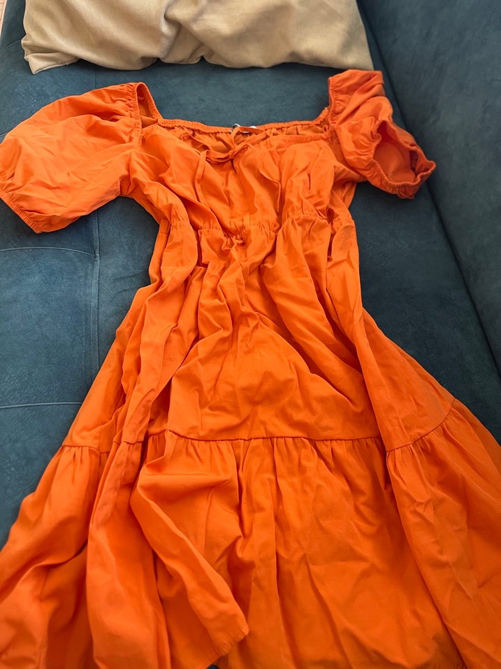 Uzun, bol kesim bohem elbise, tekne yaka ve askılı kollara sahiptir. Sentetik kumaştan üretilmiş, parlak turuncu renkte ve volan detaylıdır, günlük kullanım için uygundur.