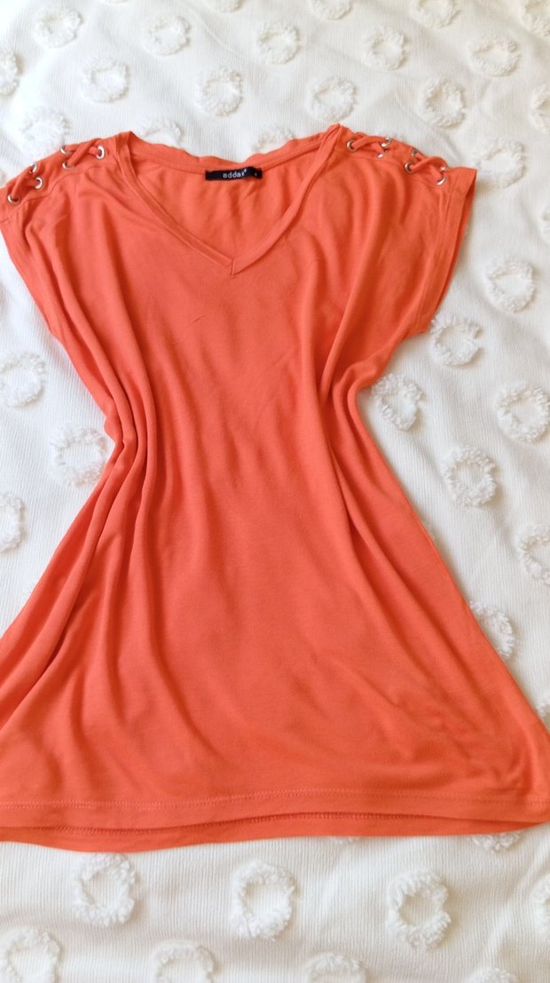 Turuncu, V yaka ve kısa kolludur. Omuzlarda drapeli detaylar vardır.cok kullanılmadı yeni gibi omuzdan boy 65 kol altı en 46cm