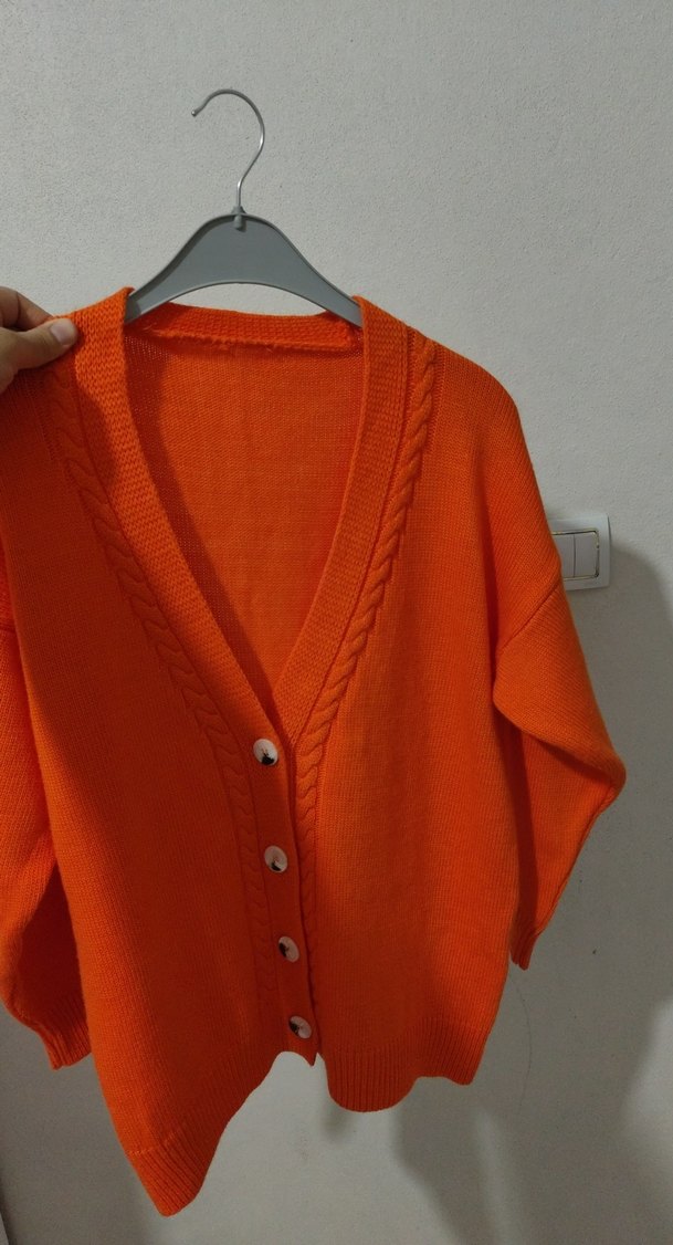 Turuncu renkte, düğmeli ve V yakalı örme kumaştan yapılmış, uzun kollu, bol kesim midi boy kadın hırkası. Rahat ve şık bir görünüm sunar.