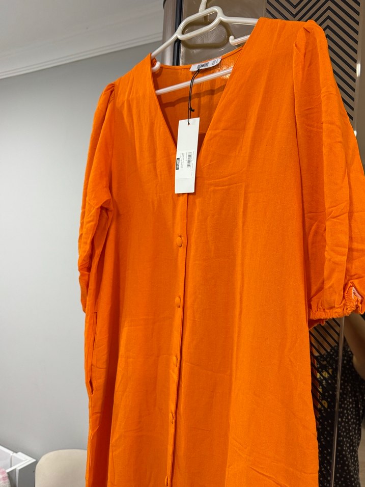 V yaka ve düğmeli, uzun ve bol kesim keten elbise. Kısa kollu, parlak turuncu renkte, minimal desenli, günlük kullanıma uygun.