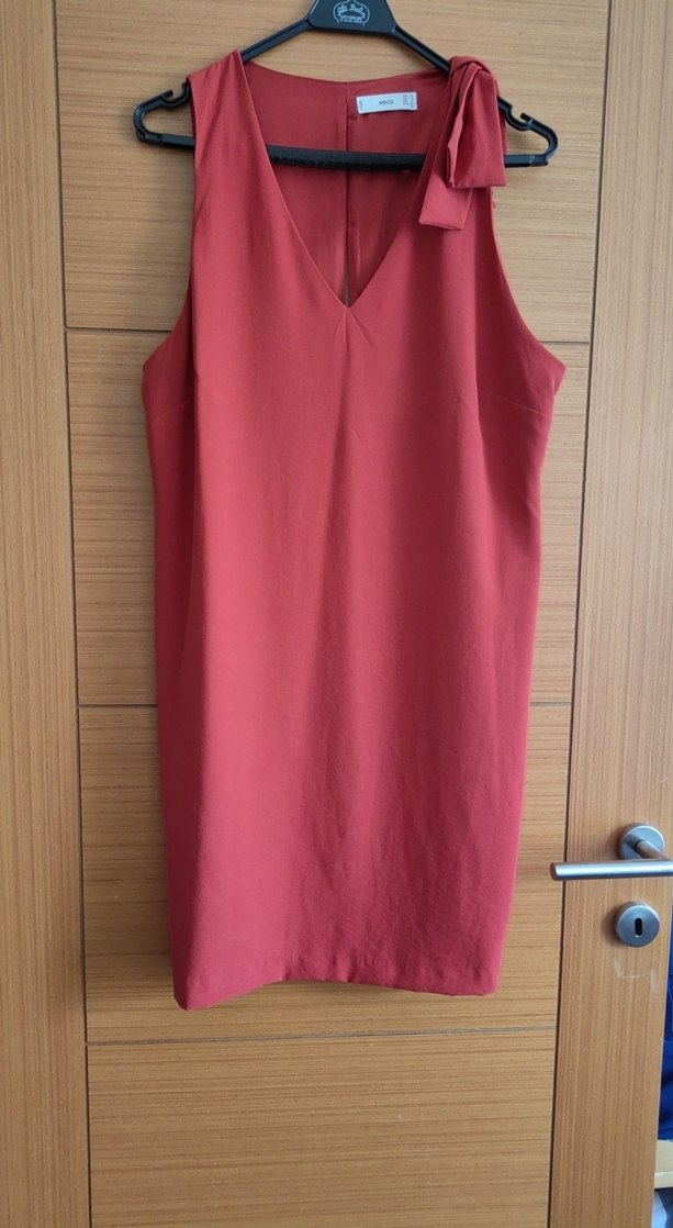 Turuncu parlak sentetik kumaştan, kolsuz V yaka, drapeli elbise. Normal uzunlukta ve regular kesim, günlük kullanım için uygundur.