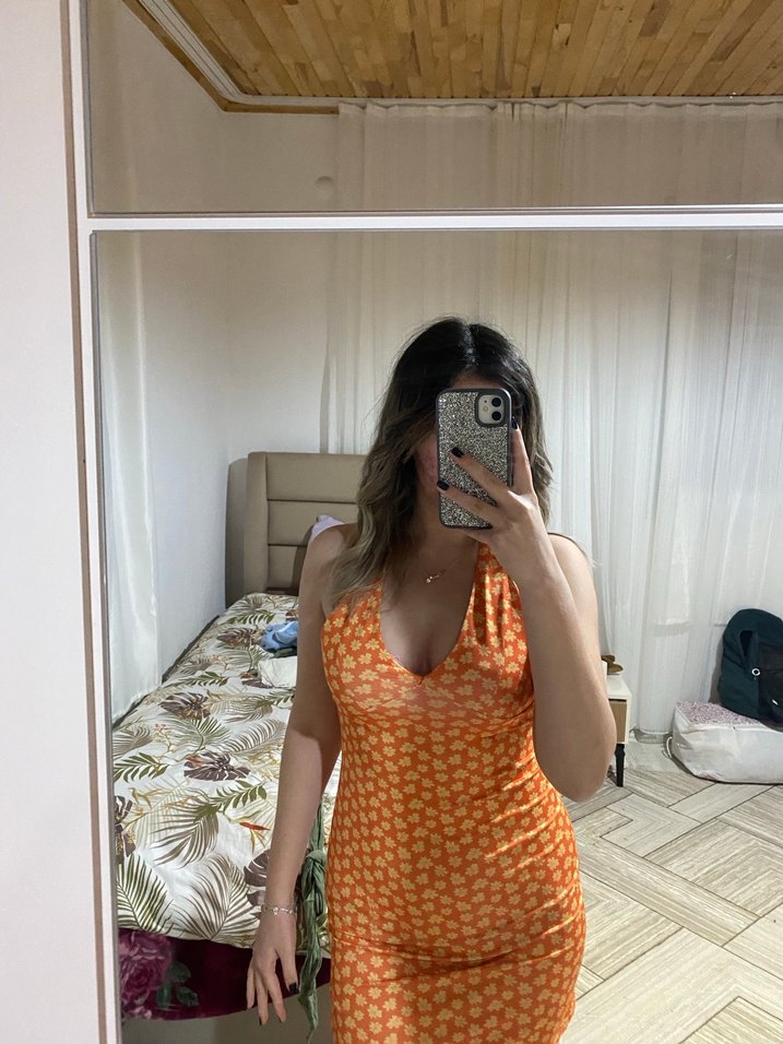 Turuncu tonlarında, V yakalı ve kolsuz, bağlama desenli midi boy bohem elbise. Sentetik kumaştan, hafif transparan detaylı, günlük kullanıma uygun.