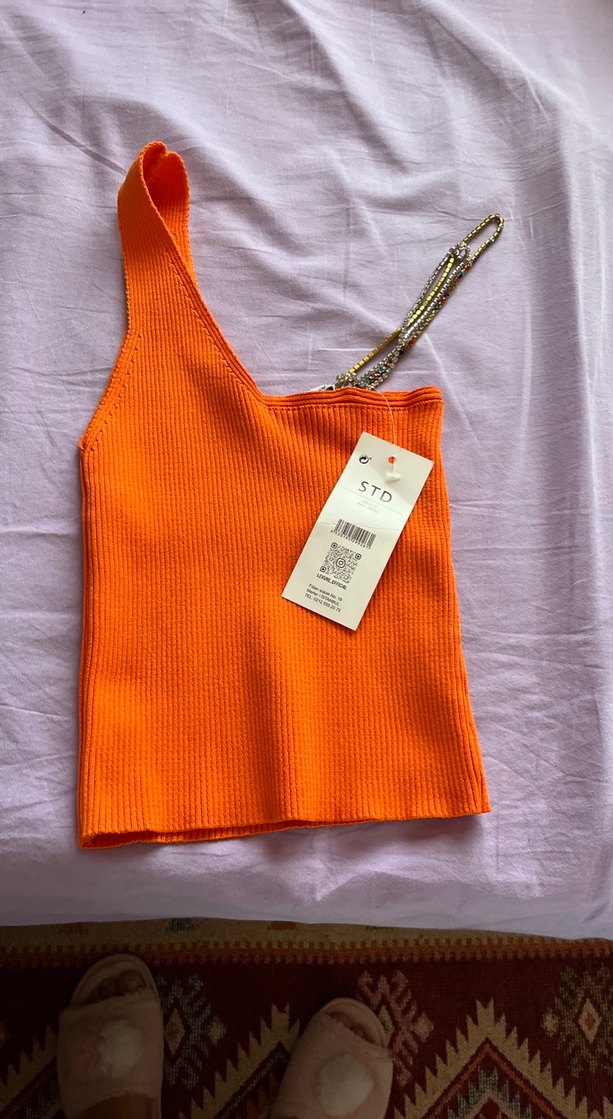 Turuncu renkli, V yaka, örgü kız çocuk süveter. Kolsuz ve dar kesim olup sokak stiline uygundur. Sentetik kumaştan üretilmiştir. Etiket üzerinde 'STD' yazmaktadır.