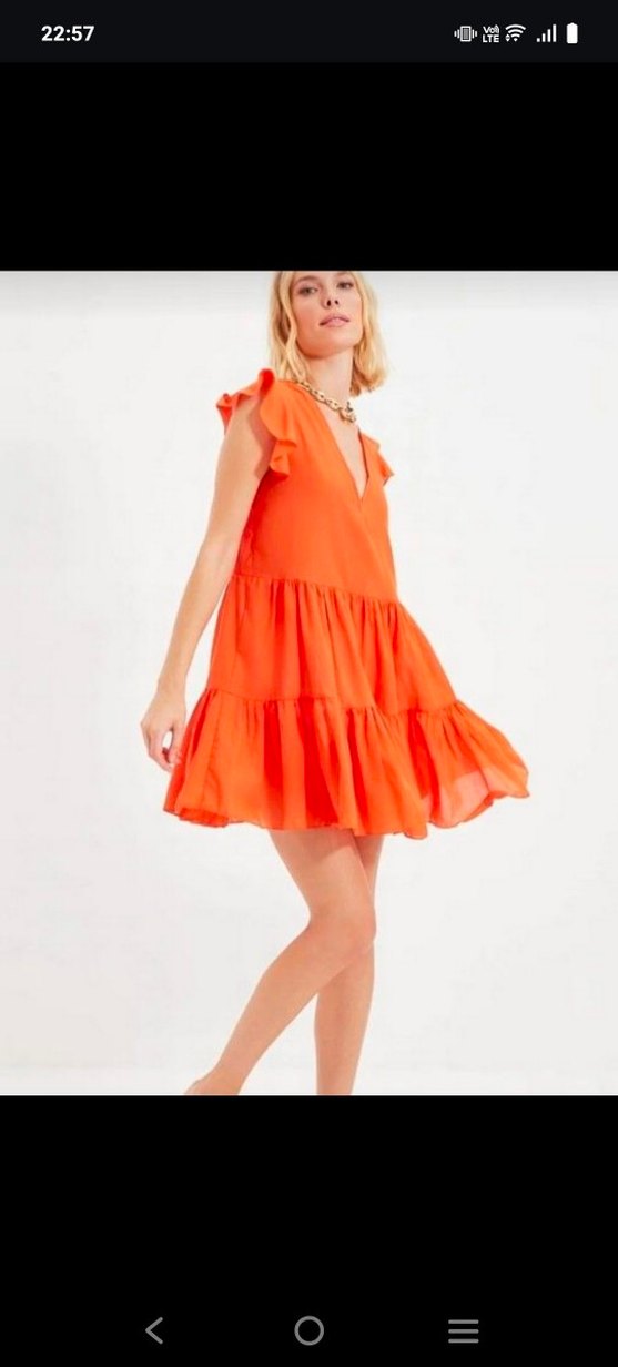 Kısa ve bol kesim olan bu elbise, parlak turuncu renkte olup V yaka plaj elbisesi boy 86 göğüs 51 bel 49 cm..
