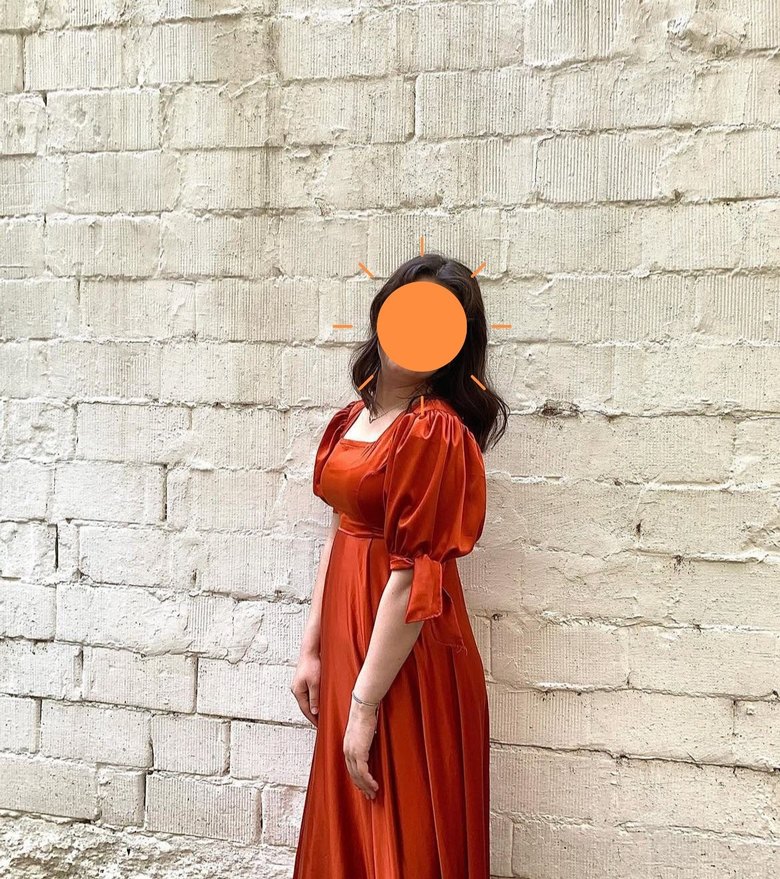 Parlak turuncu uzun elbise, V yaka ve drapeli detaylarla fitted kesime sahiptir. Askılı kollu ve ipeksi dokulu, düğünler için uygundur.