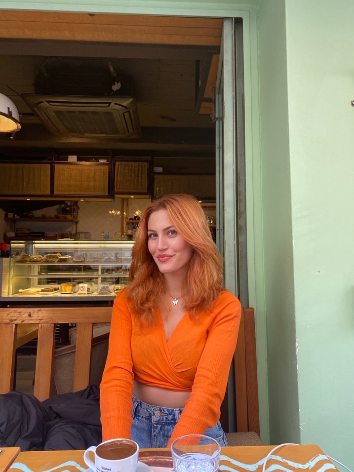 Kadınlar için uzun kollu, bol kesim keten bluz. Drapeli ve V yakalı, parlak turuncu renkte, günlük sokak stili için uygun.