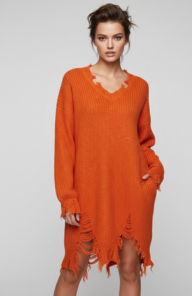 Standart beden Bu kadın kazağı, bol kesim, uzun kollu ve V yaka detayına sahiptir. Parlak turuncu renkte örgü kumaştan yapılmış olup, uzun boyu ve yırtık detaylı etek ucu ile rahat sokak stili için uygundur.