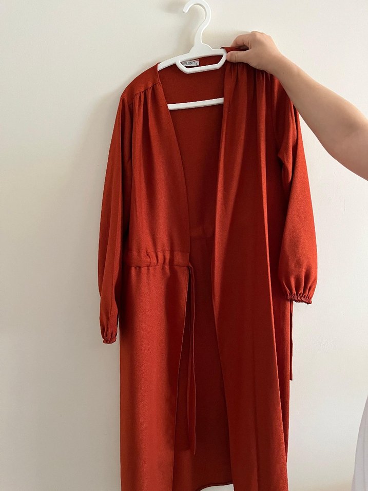 Koyu kırmızı renkte, V yakalı, uzun kollu ve midi boyda bol kesim hemşirelik sabahlığıdır. Belinde ayarlanabilir bağlama detayı bulunur.