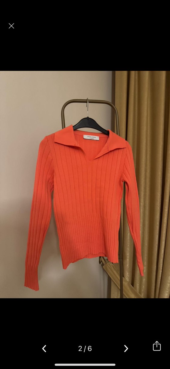 Turuncu renkte, uzun kollu ve V yakalı ince triko kazak. İnce triko kumaştan, normal boyda ve desen içermeyen sade tasarıma sahiptir.