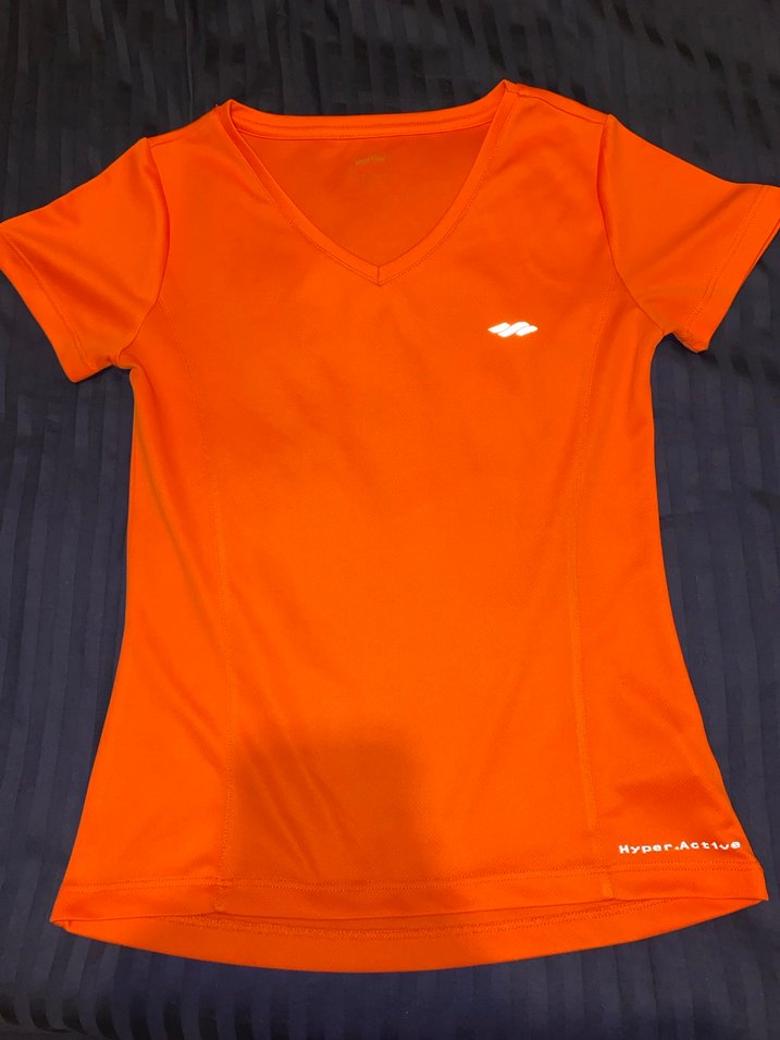 Bu turuncu renkli, V yakalı ve kısa kollu kadın tişörtü, yumuşak sentetik kumaştan üretilmiştir. Baskılı ve spor tarzıyla günlük kullanıma uygundur.