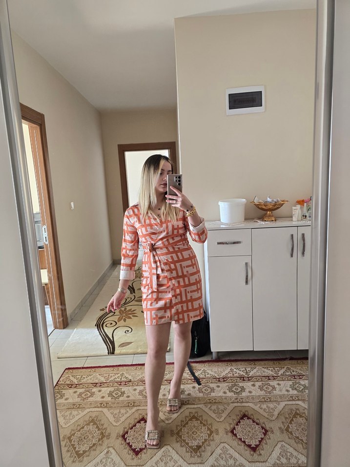 Uzun kollu, V yakalı ve kemerli turuncu mini elbise, sentetik kumaştan yapılmıştır. Günlük şık kombinler için uygundur.