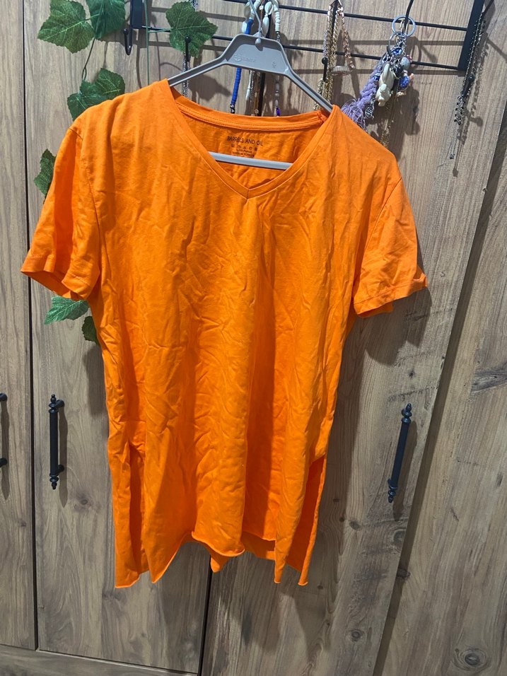 Turuncu renkte, V yakalı ve kısa kollu keten kumaştan kadın tişörtü. Rahat kesimi ve midi boyu ile günlük kullanıma uygundur.