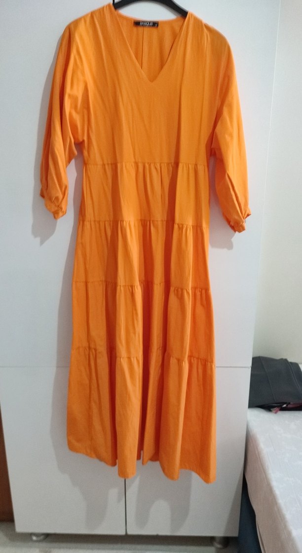 Turuncu kumaştan, V yakalı, bol kesim uzun elbise. 1 kere giyildi 36 beden ama 38 40 a daha iyi olur