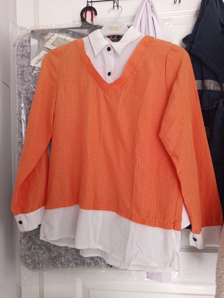 Renkli turuncu uzun kollu gömlek, V yakalı ve düğmeli detaylara sahip, bol kesim ve beyaz katmanlı görünüm sunar. Günlük sokak stiline uygundur.