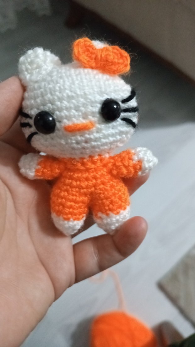 Turuncu ve beyaz renkli el örgüsü oyuncak kedi