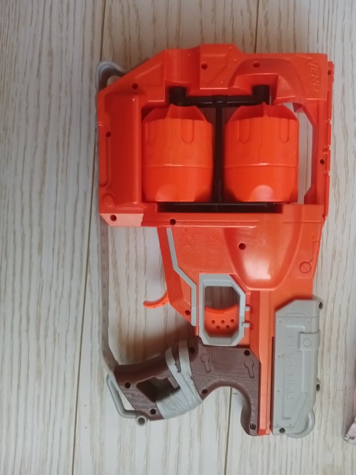 Turuncu ve gri renklere sahip oyuncak tabanca, çift tamburlu şarjör ve tetik mekanizması içerir. Nerf orjinal temiz kullanılmış mermileri yok o nedenle fiyatı uygun tutuyorum.