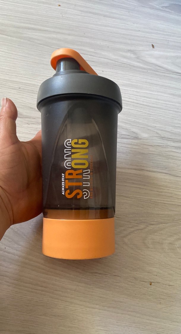 Gri gövde ve turuncu kapak ile tabana sahip suluk Yanında 'ALWAYS STAY STRONG' yazısı bulunur.