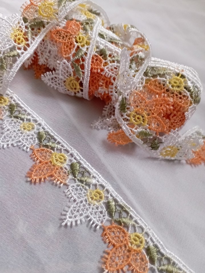 Turuncu, sarı ve beyaz çiçek desenlerine sahip bohem tarzda ince işlenmiş dantel şerit.