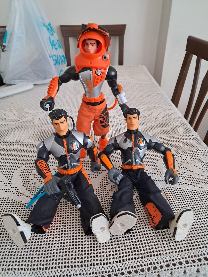 Turuncu ve siyah renklere sahip, biri kasklı üç adet detaylı aksiyon figürü seti. Seti ister tek tek ister 3 lü birtanesi kusurlu.Başı kopmuştu.2 fiyatına 3 adet