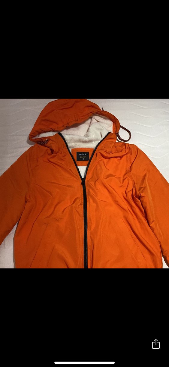 Turuncu kapüşonlu ve fermuarlı, yumuşak ve sıcak kumaştan yapılmış bol kesim kadın ceket. Uzun kollu ve parlak görünümlü, dış mekan kullanımı için uygundur .