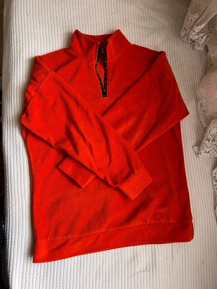 Yarım fermuarlı, uzun kollu, bol kesim turuncu kadın polar sweatshirt. Sokak stili ve günlük kullanıma uygun rahat bir parça.