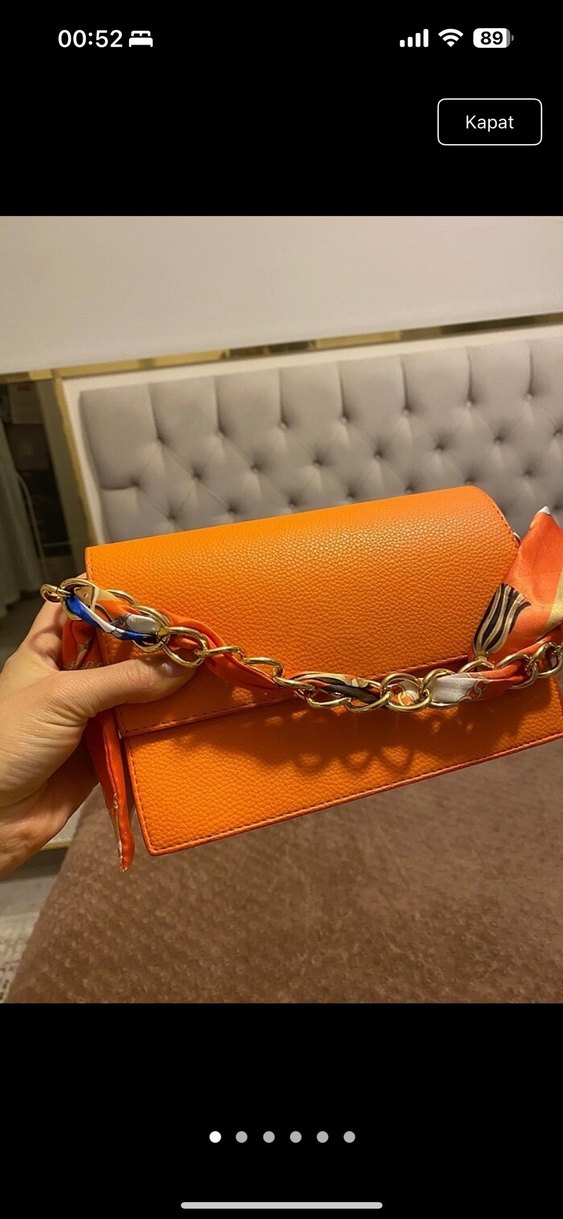 Turuncu yılan baskılı deri çanta, zincir detayı ve renkli tasarımıyla çağdaş ve trend günlük kullanıma uygun. Marka temsili