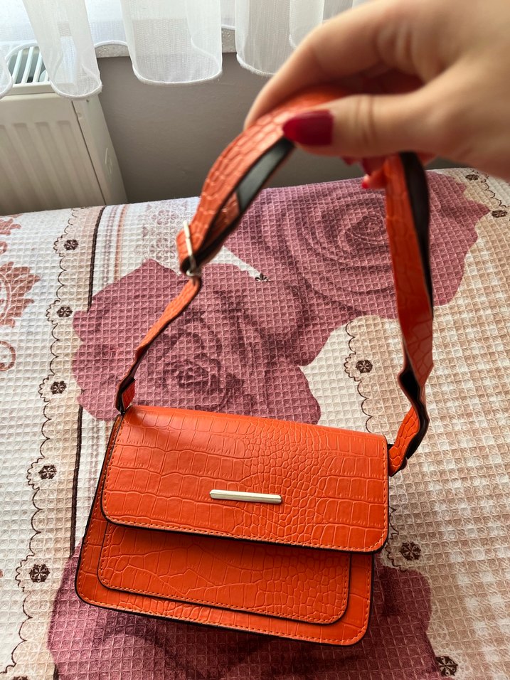 Turuncu yılan derisi desenli, tokalı deri kadın çantası, günlük ve sokak modasına uygun şık bir parça.