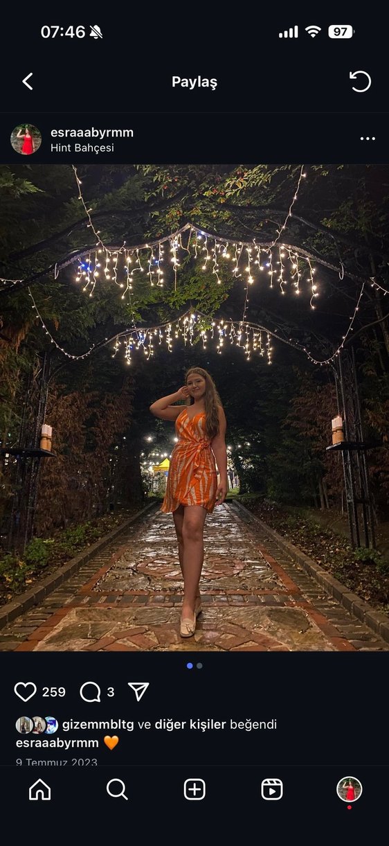 Turuncu, parlak yılan desenli, drapeli, halter yakalı, askılı kısa elbise. Bohem tarzıyla romantik akşamlar için uygun. 40 beden bir iki kez giyildi