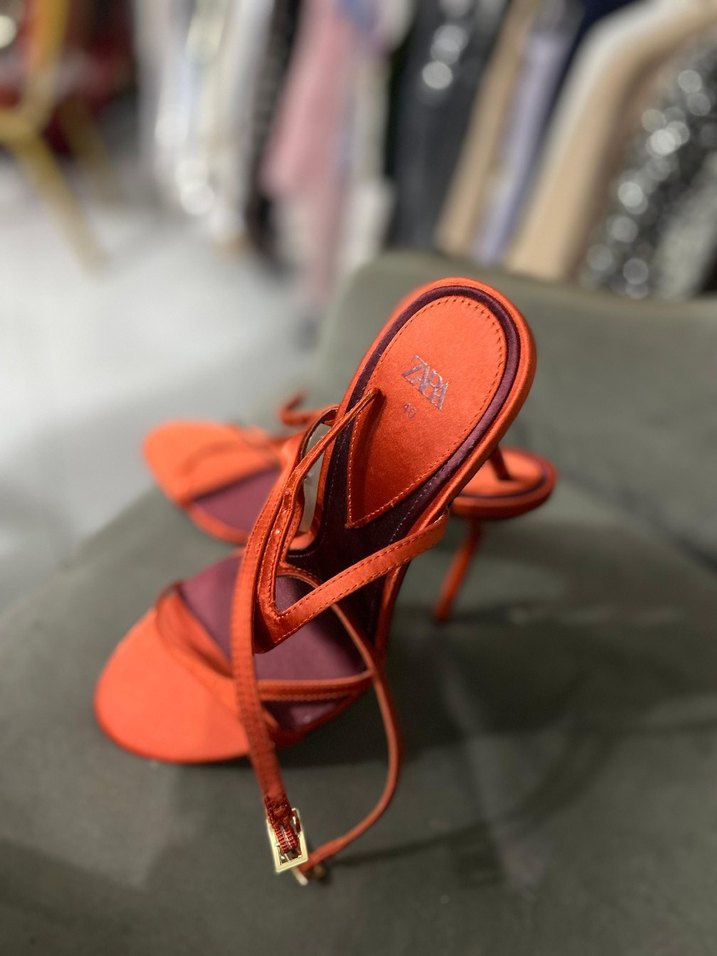 Turuncu yılan desenli, tokalı ve stiletto topuklu kadın gece ayakkabısı, modern ve şık bir tasarıma sahiptir.