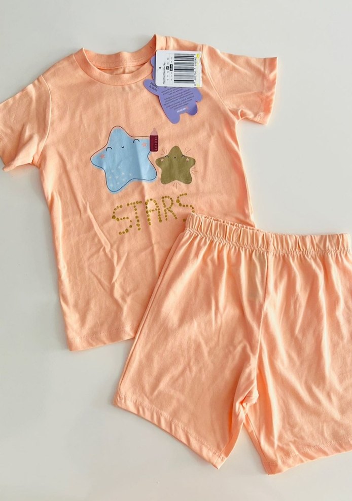 Pastel turuncu renkte, yumuşak sentetik kumaştan yapılmış, yıldız desenli çocuk pijama takımı. Kısa kollu üst ve şort içerir, rahat uyku için uygundur.