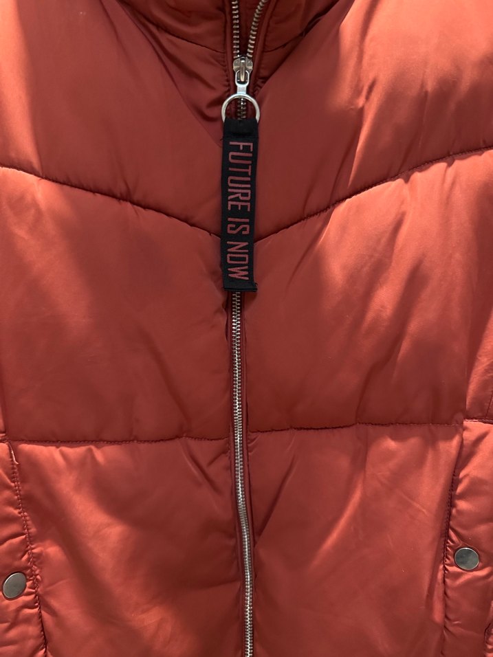 Parlak turuncu kiremit renkli, yüksek yakalı ve fermuarlı, midi boyda kadın kışlık mont. Sentetik kumaştan olup, atletik ve sokak tarzını yansıtır. 'FUTURE IS NOW' yazılı detay içerir. ❄️