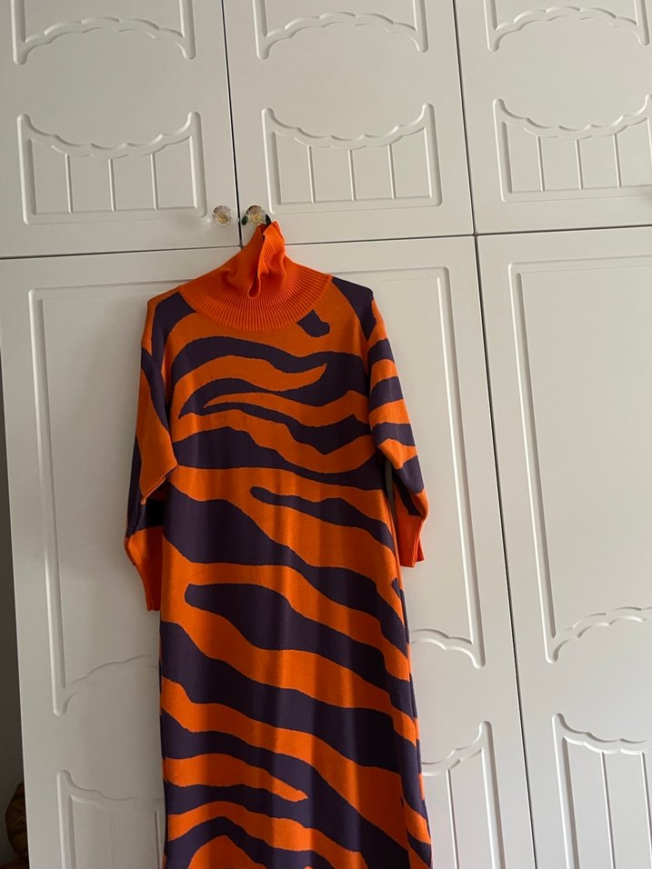 Turuncu Zebra Desenli Uzun Balıkçı Yaka Elbise