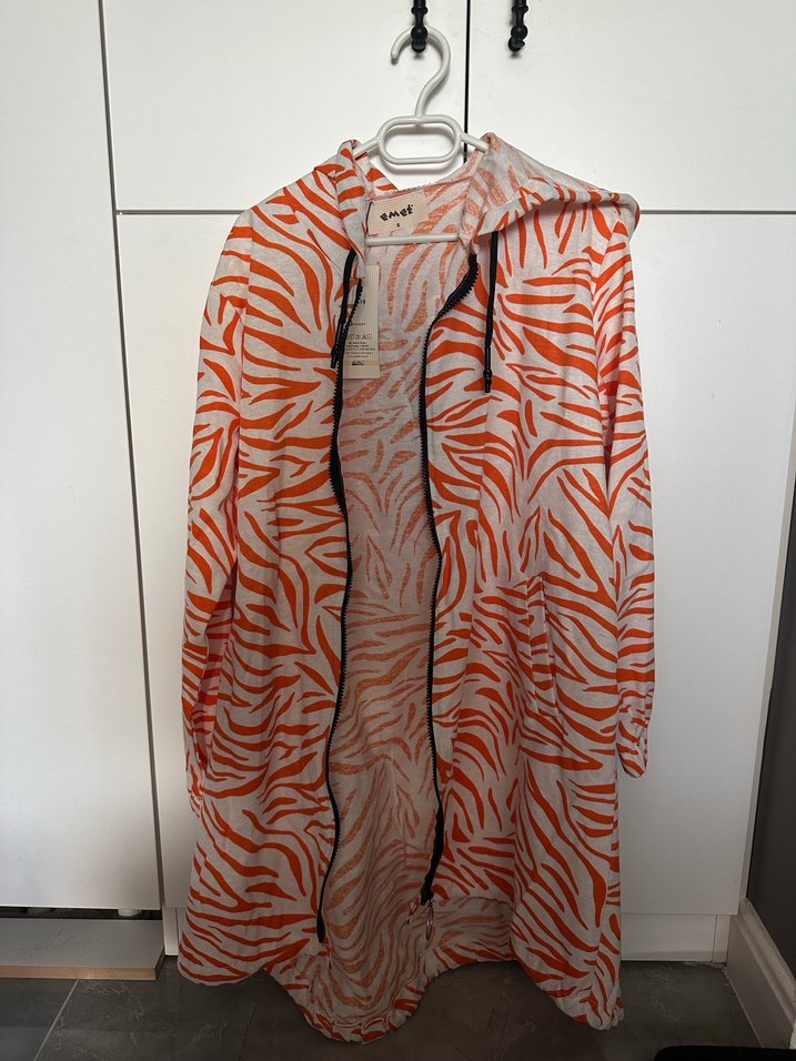 Turuncu zebra desenli, kapüşonlu ve uzun kollu, sentetik kumaştan yapılmış uzun ve bol kesim kadın yağmurluğu. Sokak modası ve athleisure tarzına uygun drapeli tasarım.