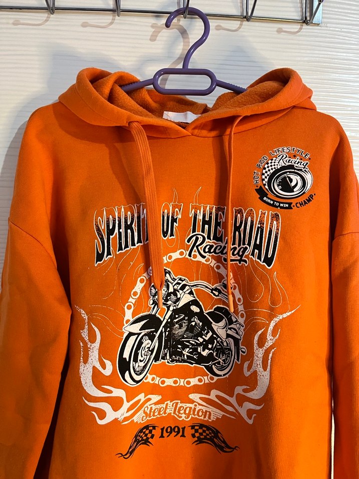Turuncu, uzun kollu, zincir detaylı baskılı biker sweatshirt. Rahat kesimli ve yumuşak kumaştan, rock punk sokak stilini yansıtıyor.
