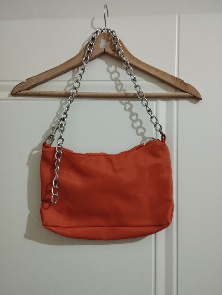 Turuncu deri çanta, zincir askı ve desensiz minimal tasarıma sahip, gündelik şık sokak stili için uygun.