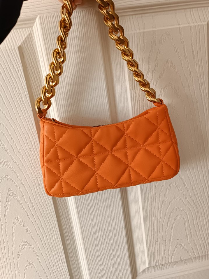 Parlak turuncu deriden yapılmış, zincir detaylı ve kapitone desenli kadın çantası, şık ve gündelik kullanım için uygun.