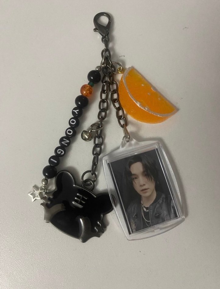 Turuncu dilim, siyah kedi figürü ve fotoğraf çerçevesi içeren zincir detaylı kadın anahtarlık, goth ve punk tarzını yansıtıyor. bts yoongi suga keychain