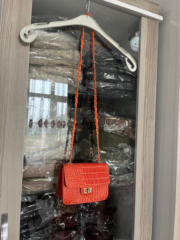 Turuncu deri çanta, renkli yılan deseni ve zincir detaylarıyla dikkat çeker. Cesur sokak stili ve günlük kullanım için uygundur.