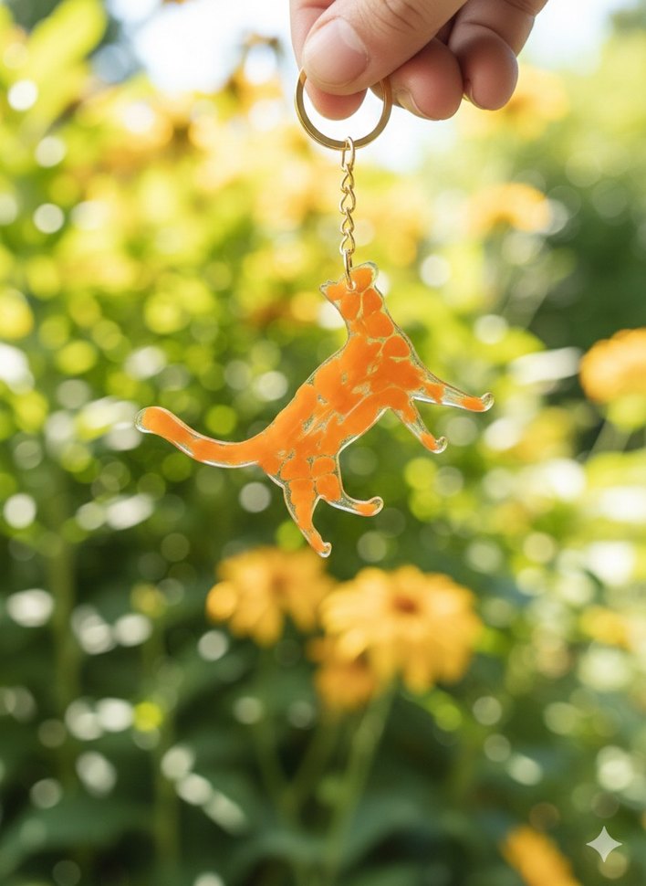 Turuncu renkte, zincir detaylı kedi figürlü renkli anahtarlık, el yapımı recineden yapılma sağlamdır