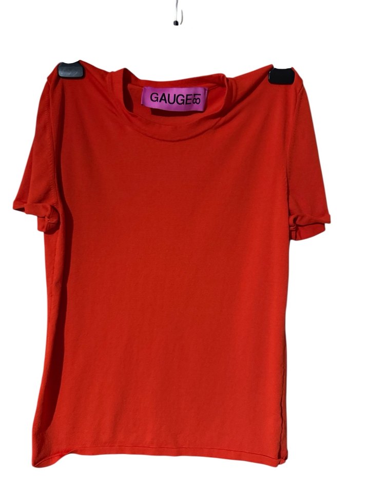 Turuncu renkte, kısa kollu, yuvarlak yakalı ve bol kesim olan bu tişört, yumuşak ve sıcak kumaştan üretilmiştir. Renkli baskılı ve kısa boyda, günlük kullanım için uygundur. Üzerinde GAUGE5 etiketi vardır.