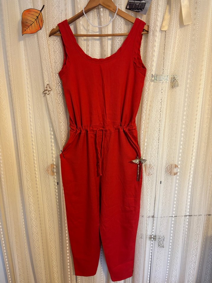 Kemerli, kolsuz kırmızı keten tulum, bol kesim ve bohem tarzıyla öne çıkar. Yuvarlak yaka ve midi boydadır, günlük kullanıma uygundur. Yazlık bir tulum, ince kumaşa sahip. S beden