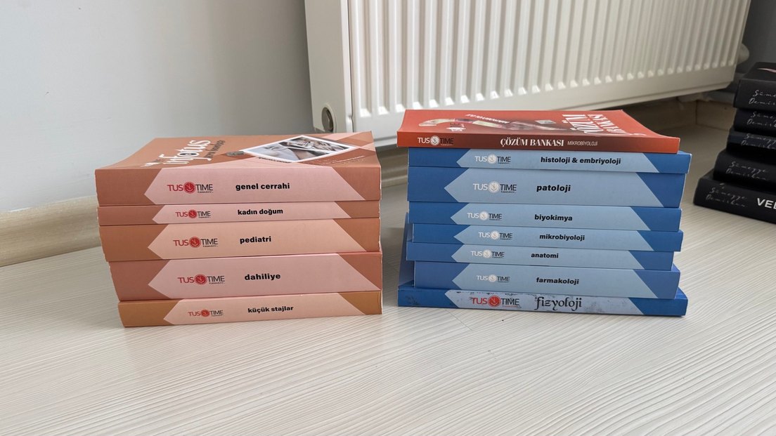Genel cerrahi, kadın doğum, pediatri, dahiliye ve küçük stajlar konularını içeren TUS sınav hazırlık kitapları seti. TUSTIME ve COZUMBA serileri dahil. Histoloji ve Fizyoloji çözülmüş, biyokimyanın ilk 2-3 konusu çözülü. Diğerleri tertemiz