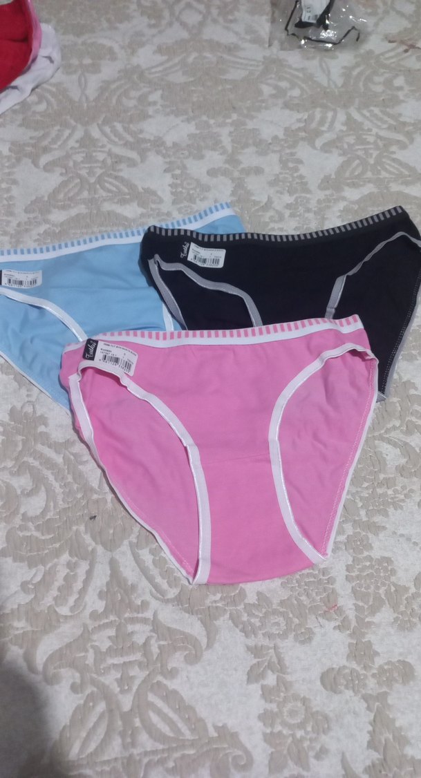 Kadınlar için pastel pembe, mavi ve siyah renklerde beyaz şeritli üçlü midi külot seti, rahat bir kullanım sunar. small ve medium bedenleri uygundur #Tutku #iççamaşırı