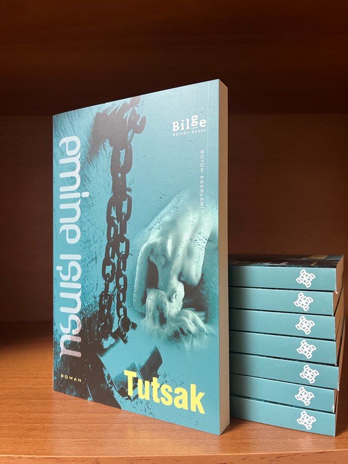 Emine Işınsu'nun Tutsak adlı romanı. Kapakta zincirli bir el yer alıyor, tutsaklık ve mücadeleyi simgeliyor.