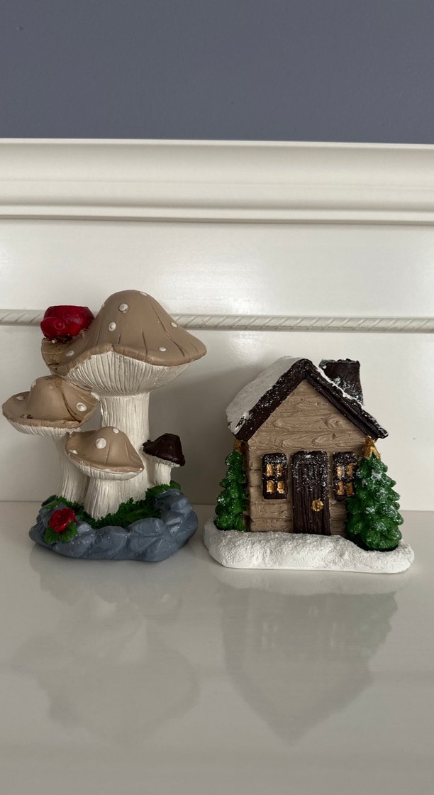Kırmızı uğur böceği detaylı kahverengi mantar biblosu ve karla kaplı küçük kahverengi ev biblosundan oluşan set.