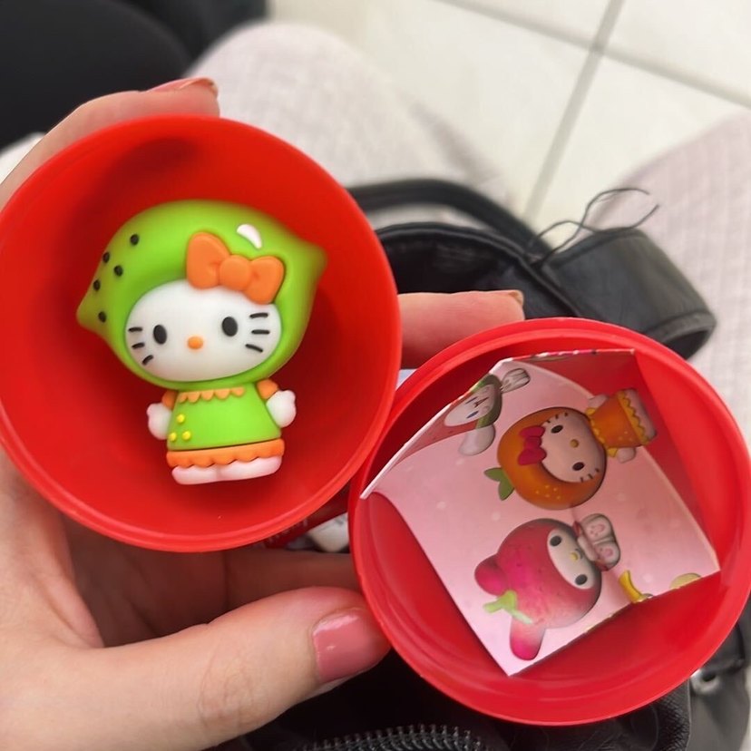 Yeşil ve turuncu giysili renkli Hello Kitty figürü, kırmızı kapsül içinde ve benzer karakterlerin bulunduğu küçük kartla birlikte. Yeni seri son fiyat!!