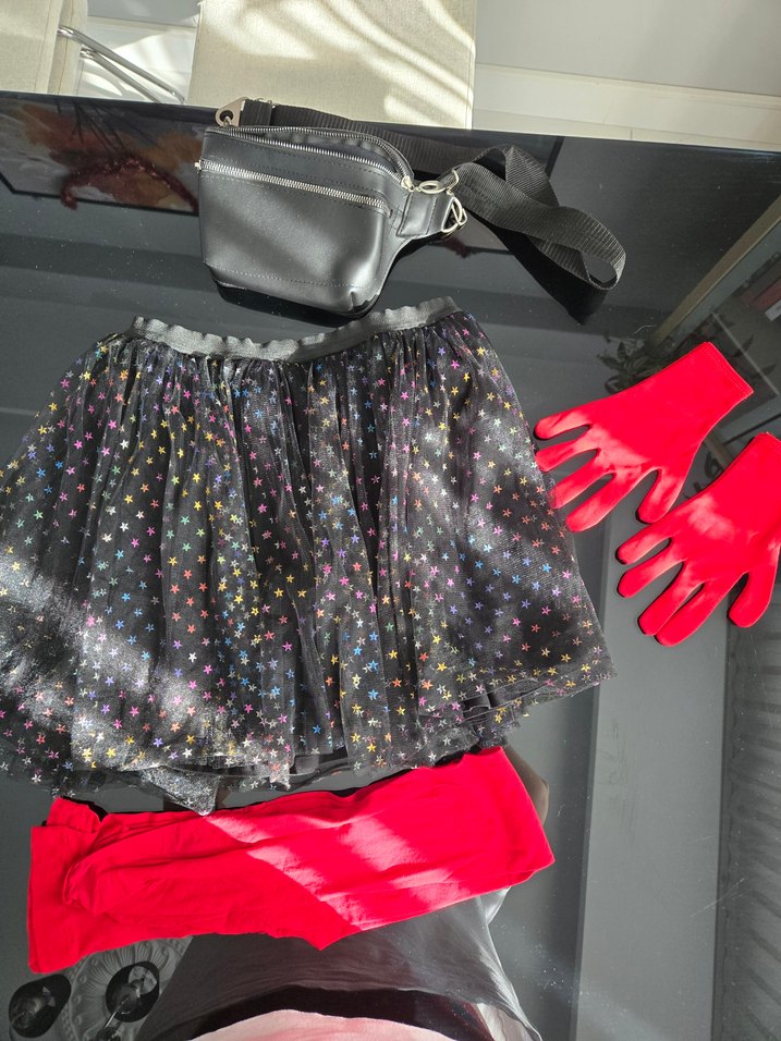 Renkli ve simli yıldız desenli kız çocuk etek (alt penye üst iki kat tül ).Kırmızı eldiven .muz çorap ve bel çantası