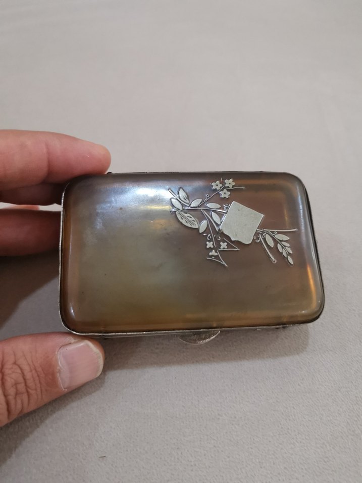 Boynuzdan yapılma . üstteki işleme gümüş . eski tabaka ölçüler = 8cm ,5 cm ,2.5 cm